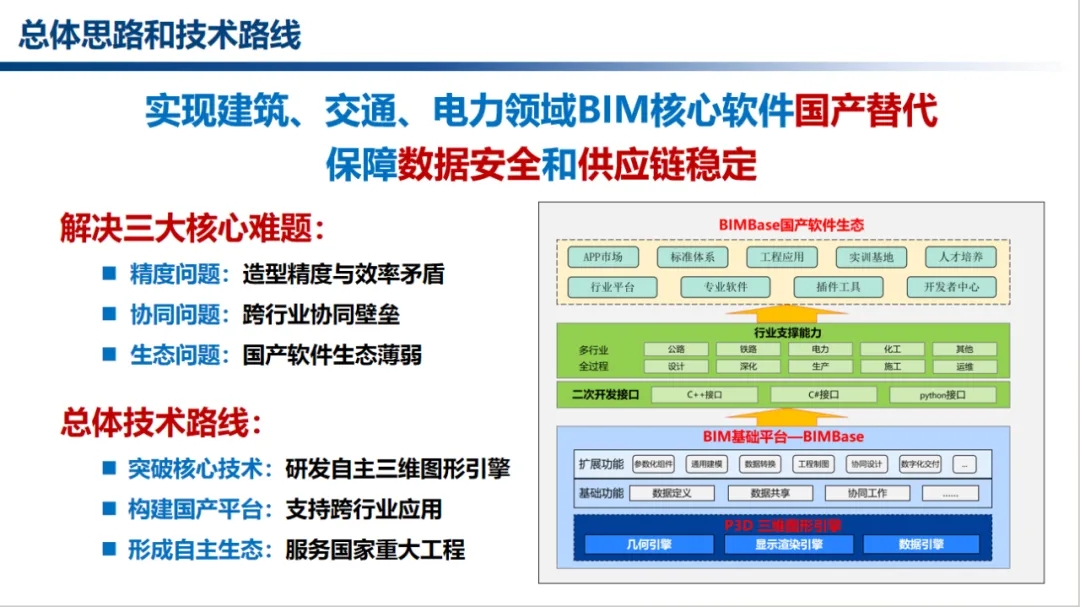 项目内容:本项目面向建筑行业数字化转型与国家信息安全重大需求,针对我国BIM软件长期依赖国外技术、核心三维图形引擎“卡脖子”、数据安全风险突出等根本性问题,研发了国内首款完全自主知识产权的BIM三维图形引擎P3D及BIM底座平台BIMBase,核心源代码自主率达100%,攻克几何造型复杂度控制、海量模型轻量化渲染、多源数据互通等核心技术,关键性能指标达到国际主流水平,填补了国内BIM图形引擎和基础平台的空白。基于该平台开发的PKPM-BIM、PKPM-PC等70余款专业软件,覆盖建筑设计、装配式建造、绿色低碳分析、智能审查等全生命周期场景,实现从方案设计、构件生产到施工运维的全流程数据贯通,打破了国外软件在建筑工程核心领域的长期垄断,实现了国产BIM软件从“无芯可用”到“生态构建”的跨越式突破。目前,BIMBase系列软件已推广应用于全国6000余家企业,覆盖3亿平米建筑工程。项目编制标准10余项,软件著作权70余项、发明专利14项,近三年经济效益突破3.8亿元。项目成果显著提升了建筑行业数字化水平,成为我国工程建设领域数字化转型的标志性成果。