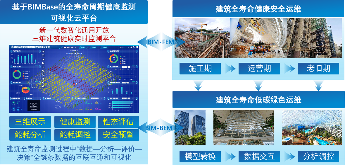 项目内容:针对现阶段建筑安全及能耗整体综合性能状态的分析、理解、预警难度大,结构安全与建筑能耗运维效率低,海量建筑数字信息安全可控能力不足的问题,本项目面向我国“数字住建”建设发展目标,积极响应数字化转型背景下建筑全寿命周期内健康与绿色运维的重大需求,搭建了基于国产自主知识产权BIMBase的建筑全寿命周期健康监测可视化云平台,提出了建筑围护结构与主体结构关联性分析与一体化监测技术,开发了建筑在实际运行边界条件下的最优能效仿真平台,研制了基于BIMBase平台的建筑信息模型到建筑能耗模型的高效转换工具,形成了建筑安全与能耗数字化集成监测成套关键技术体系。项目成果适用于各类新建及既有建筑的结构健康监测与预警,同时具备建筑节能系统的数字化监控、能耗监测与管理能力,可拓展应用于陆地与海洋风电、核电、光伏等新能源设施,以及桥梁、隧道等建设工程领域的安全运维。