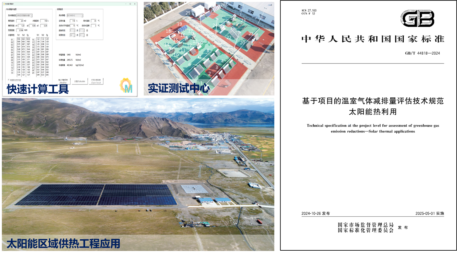 项目内容:太阳能热利用是节能减排,实现“双碳”目标的重要方式。我国太阳能热利用的市场规模、技术实力世界领先,但缺少太阳能热利用项目温室气体减排评估标准,导致减排贡献难以准确衡量。本标准编制组联合行业企业开展太阳能热利用碳减排计算研究项目,首次梳理明确基准线及确定方法,提出基于实测参数进行年度动态计算的评估方法,并建立碳减排测试中心开展不同类型太阳能热利用系统碳减排实证测试,最终编制完成国家标准《基于项目的温室气体减排量评估技术规范 太阳能热利用》GB/T 44818-2024及英文版。相关合作与成果为太阳能热利用项目温室气体减排评估提供有效、可靠、可量化的手段和工具,也为太阳能热利用行业提供了新的经济增长点,为国际化推广打下基础。